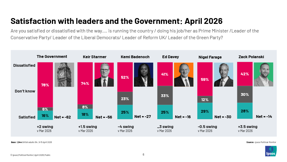- Zack Polanski: 28% satisfied (-2), 42% dissatisfied (+5). Net -14.