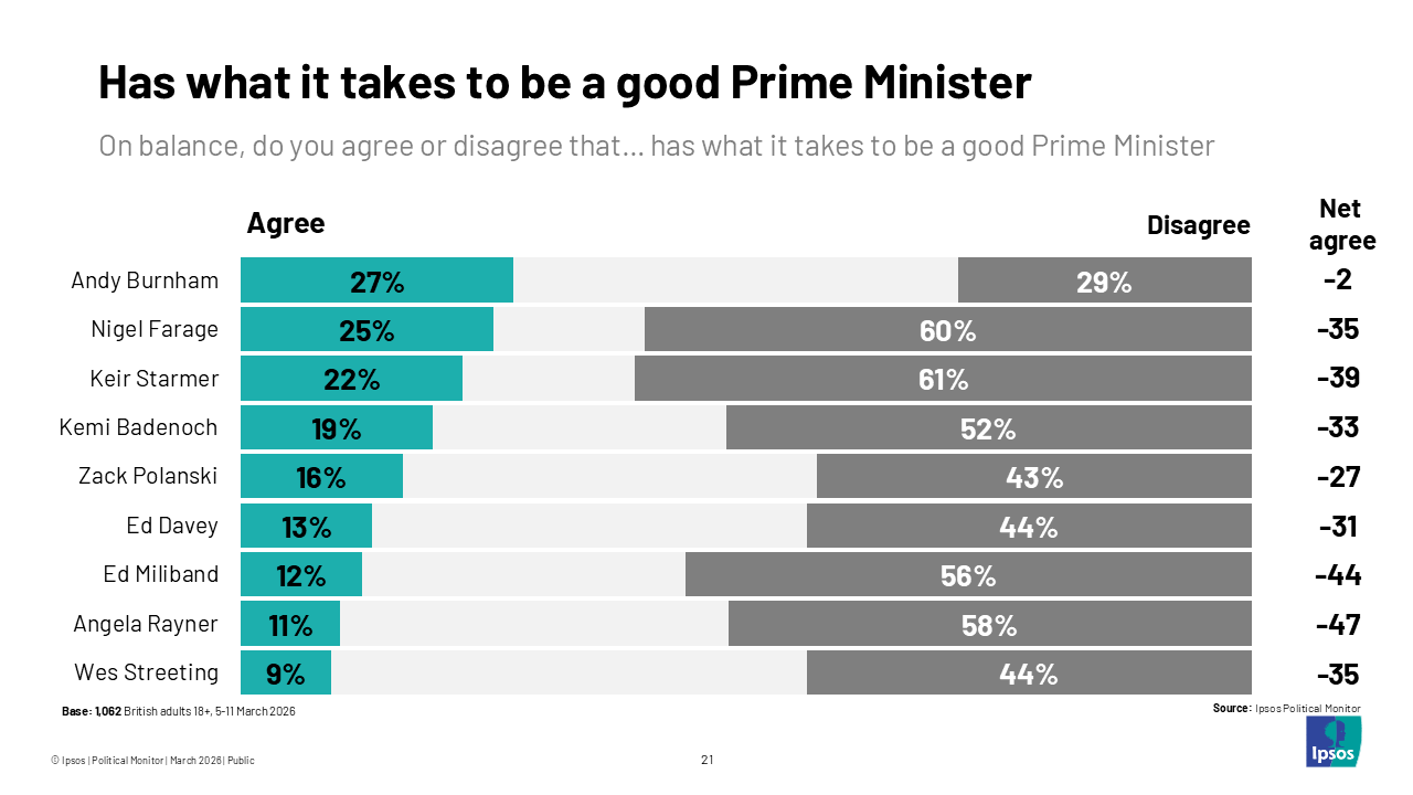 - Andy Burnham and Nigel Farage are seen as most likely to ‘have what it takes to be a good PM’. Though Keir Starmer’s figures comparable to Farage’s and stronger than Zack Polanksi of the Greens and other potential internal Labour Party rivals.