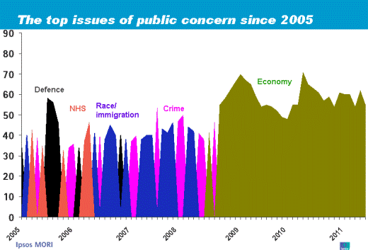 Despite the fact that crime, as reported by the British Crime Survey, was actually falling between 2004-2007, concern about crime actually increased during that period. For much of 2007 and 2008 crime jostled with race relations/immigration as the issue that concerned the public the most but in late 2008, the economy assumed the position as the most important issue, where it has remained ever since.