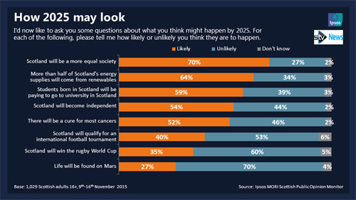 Elsewhere in the poll, most Scots think that, by 2025, Scotland will be a more equal society, more than half of our energy supplies will come from renewables, and students born in Scotland will be paying tuition fees here. Around half think that there will be a cure for most cancers in the next ten years.