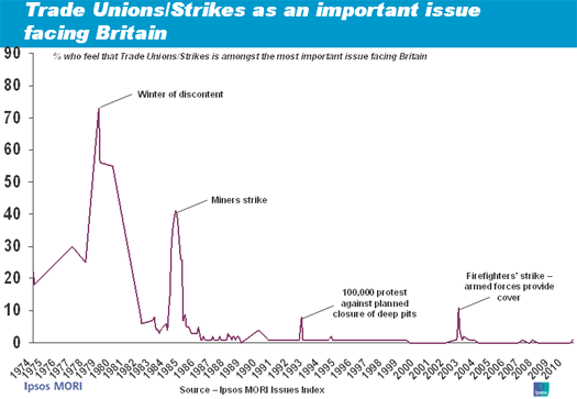 Our issues index, which has tracked the most important issues facing the country since 1974, shows that trade unions/strikes have not been considered a major issue for many years, and this remains true at the start of this month. As the below chart shows, this issue has declined markedly since the industrial unrest of the 1970s and is currently almost a non-existent issue. During the winter of discontent in 1978-79, it was the most important issue facing the country; mentioned by close to three quarters (73%) of the public. It returned briefly to prominence during the miners strike in October 1984 when it was cited by two fifths (41%) However, since then, it has disappeared from view, only once topping the 10% mark around the time of the firefighters strike.