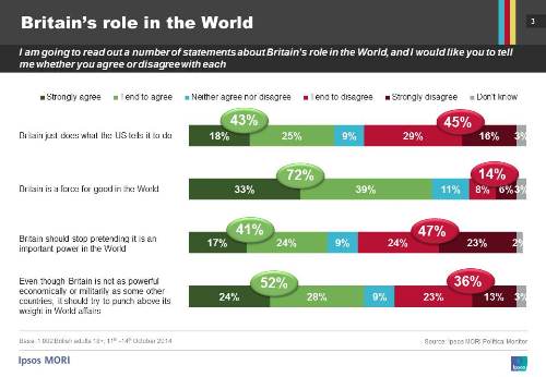 “Despite the lingering effects of the Iraq war on public opinion, the lack of support for action in Syria last year, and the belief among many Britons that the world is becoming a more dangerous place, this research shows that much of the public still think that Britain can play an important role on the world stage. But in line with other Ipsos research that shows six in ten Britons feel that that world is changing too fast, public opinion itself is not set in stone, as we see in the results that four in ten also think that Britain should stop pretending it is an important power in the world, and the recognition that there are other countries with whom Britain has important relationships.”Downloads