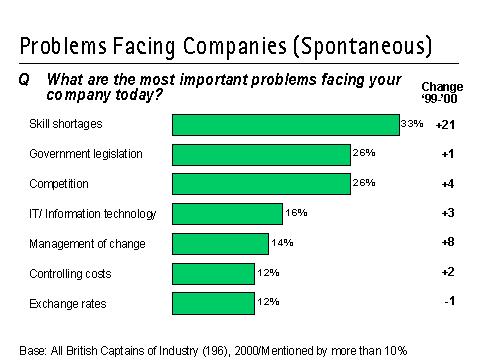 Britain's business leaders regard skills shortages as the most important problem facing their company today, according to the findings of the 2000 MORI annual survey of Britain's Captains of Industry. For the first time ever, this issue is of more concern than regulation and competition with one in three - three times as many as in 1999 - mentioning it as their major preoccupation.