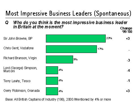 MORI interviewed 196 board directors of Britain's leading companies selected from the top 500 companies by turnover, the FTSE top 500 and the top 100 by capital employed. Interviews were conducted face-to-face with 65% among the Chairman, CEO, MD or President of the company. Fieldwork took place between 24 September and 12 November 2000.