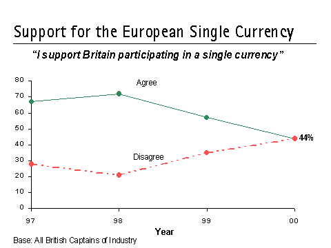 Support for the single currency continues to wane with as many disagreeing (44%) as agreeing with Britain's participation. Two years ago, over seven in ten were positive about participation, falling to six in ten in 1999. Around one in ten are now neutral on this issue.