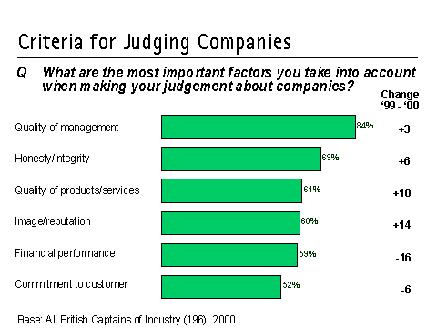 As in previous years, quality of management is the key criterion for judging a company (84%), followed by honesty and integrity (69%) Financial performance has lost some of its salience (down 16 points since 1997 to 59%) while the quality of company product and/or service offering (up 10 points to 61%) and reputation (up 14 points to 60%) have both increased in importance.