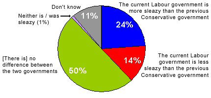 A quarter of adults (24%) now believe Labour is sleazier, compared to 12% in 2001. One in seven (14%) think the current Labour government is less sleazy than Major's government was, a figure which has halved since January 2001 (30%). Half the public, depressingly, say they do not believe there is any difference between the two Governments. A pox on both your houses.