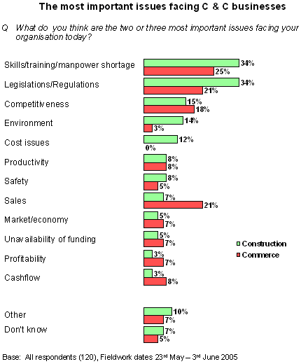 Construction businesses give higher priority to skills, training or manpower shortages (34%), legislation/regulations (34%) and competitiveness (15%), while placing environmental matters above or a par with cost issues (12%), productivity (8%) or sales (7%).