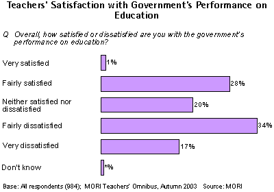 Fewer than one in three teachers is satisfied with the government's performance on education. The research by MORI, conducted in Autumn 2003 as part of the MORI Teachers' Omnibus survey, found that just 30% of teachers are satisfied with the government's performance on one of its key election pledges. One in two (51%) of those surveyed are dissatisfied, including one in six teachers (17%) who say they are very dissatisfied.