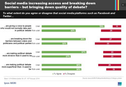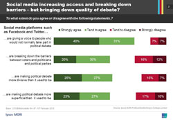Ahead of a major debate hosted by Ipsos, King’s College London and the Media Standards Trust, new research reveals that the British public has an ambivalent attitude towards the impact of social media platforms such as Facebook and Twitter on political debate.