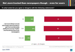 So while social media seems to be complementing and adding to traditional news media, it does not seem to be replacing it entirely. Only one in five Britons (19%) say they are more likely to trust political information they get from social media platforms than from newspapers, while 59% disagree. Even among social media users themselves, the proportions are similar, although 18-24 year olds are the most likely to trust social media more, at 32%.