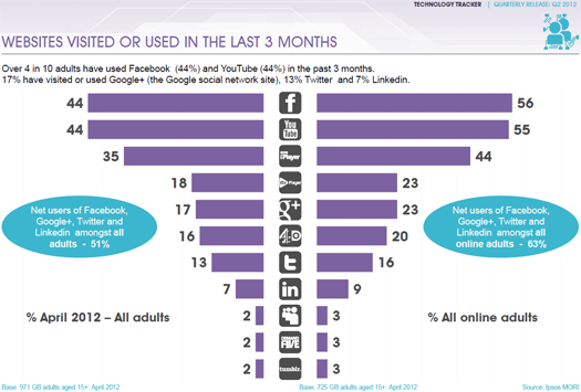 New research from Ipsos MediaCT’s Tech Tracker shows that over 4 in 10 adults have used Facebook (44%) and YouTube (44%) in the past 3 months. 17% have visited or used Google+ (the Google social network site), 13% Twitter and 7% Linkedin.