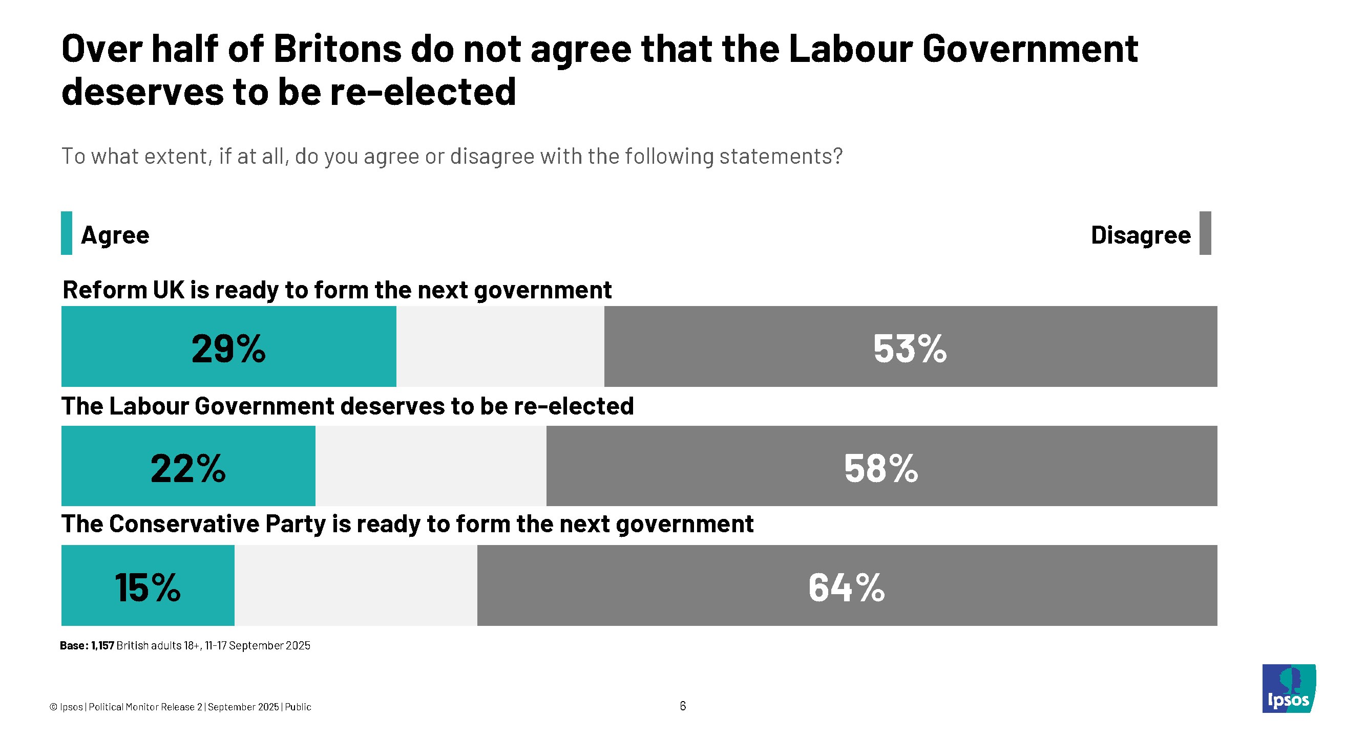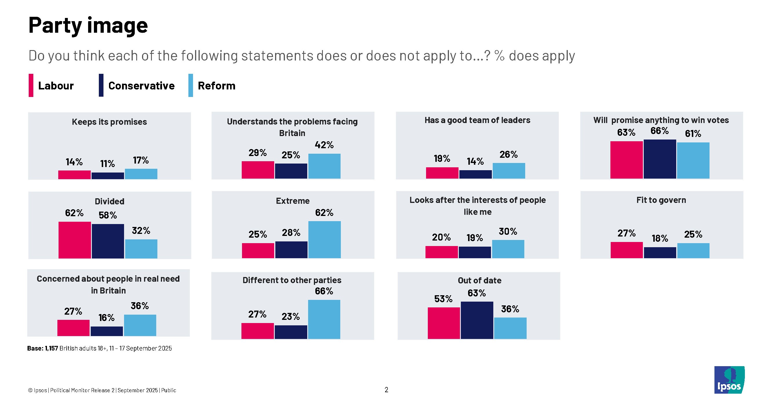 New data from Ipsos’ latest Political Monitor, taken before the Labour and Conservative Party conferences, shows the public are deeply sceptical about the Conservatives returning to government. Meanwhile, Reform UK have a strong party image but the public are yet to be convinced they are ready for government either. Fieldwork carried out 11-17 September 2025.