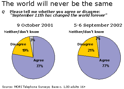 Yet the public's conviction that 'The world will never be the same' has remained solid, with seven in ten people in agreement that the world has changed forever, then (9 October 2001) and now (5-8 September 2002) - see graph. Further, a quarter of the British public are convinced that 'September 11th will change my life forever'.