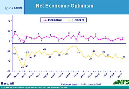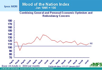 Ipsos interviewed a sample of 1800 people chosen to be representative of the British population, aged 16+ over the period 11-17 January 2007. The Mood of the Nation index combines data on personal economic confidence, general economic confidence, fear of redundancy and the actual level of unemployed to give a single figure: this was set to 100 in January 1995.
