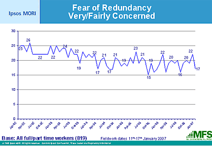 Redundancy is a fear that British workers appear to have only in the corner of their minds. From a low of 16% of those surveyed saying they were 'very' or 'fairly concerned' in March 2006, this increased sharply to 22% by December. By January 2007 this had dropped back to 17%.