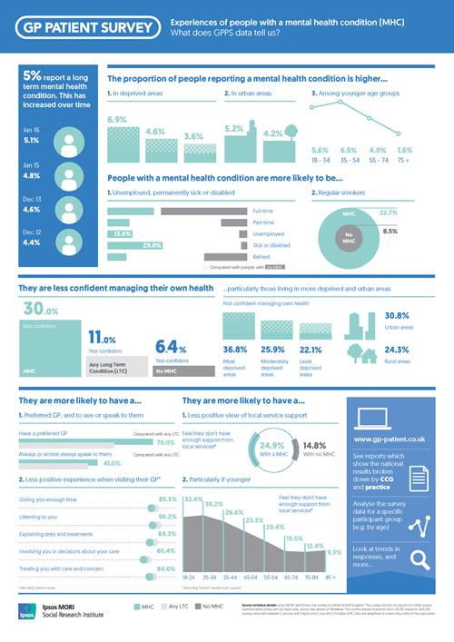 The GP Patient Survey (GPPS) helps us understand a little bit more about the experiences of patients reporting a long-term mental health condition, in relation to general practice.