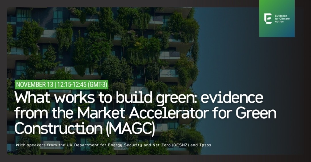 At a COP30 side event hosted by the World Bank Independent Evaluation Group Evidence 4 Climate Action (E4CA), Ipsos had the opportunity to present key findings from our independent evaluation of the International Climate Finance (ICF) Market Accelerator for Green Construction (MAGC). A joint initiative by the UK’s Department for Energy Security and Net Zero (DESNZ) and the International Finance Corporation (IFC), MAGC aims to accelerate green building markets across 24 emerging economies. The programme is a multi-component intervention engaging mainly with financial institutions and the construction industry, providing support through concessional finance, advisory and capacity building, green building certification, and evidence generation.