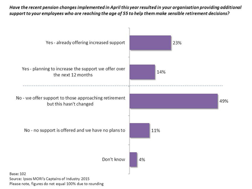 More than a third of the UK’s largest businesses have started or plan to offer additional support to those reaching the age of 55 as a direct result of the new pension freedoms, according to findings of the latest Ipsos Captains of Industry1 survey. This is in addition to around half who say they are already providing support for their employees approaching retirement.