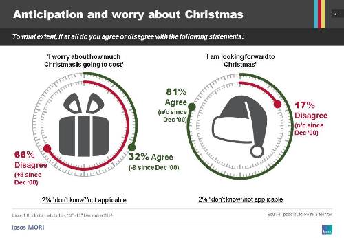 One in three (32%) are worried about the cost of Christmas, while 66% are not worried. This is down from the beginning of the century, however; 40% were worried about Christmas costs in December 2000, while 58% were not worried. Young people are more likely to be feeling the festive financial strain: more than four in ten (43%) of 18-34 year-olds are worried about Christmas costs, compared with just 23% of those aged 55+.