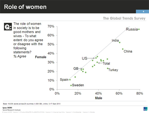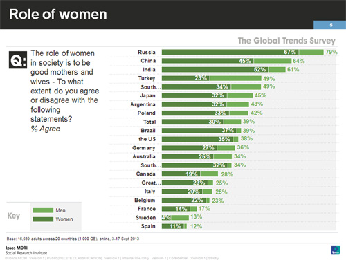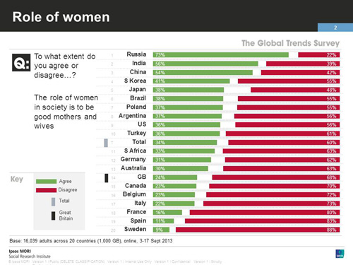 Across the globe there are significant discrepancies in how the sexes view the role of women in society, with men more likely to take a traditional view. And this is not just true of the countries at the top of the table, such as Russia (67% of women agree, compared with 79% of men), India (52% of women, 61% of men) and China (45% of women, 64% of men). Even in countries that are less likely to view a woman’s role in society as being a good wife and mother, there is still a difference in the views of men and women, such as in Sweden (4% of women agree, compared with 13% of men) Canada (19% of women, 28% of men), Australia (25% of women, 34% of men) and Germany (27% of women, 36% of men).
