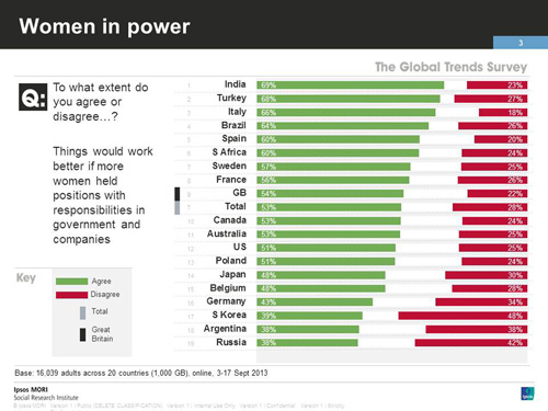 Meanwhile, half of Britons (54%) agree that things would improve if women held more positions of power, in line with the global average of 53%. India (69%), Turkey (68%), Italy (66%) and Brazil (64%) are the most likely to feel that more women in power would be beneficial to the way things work in their country.