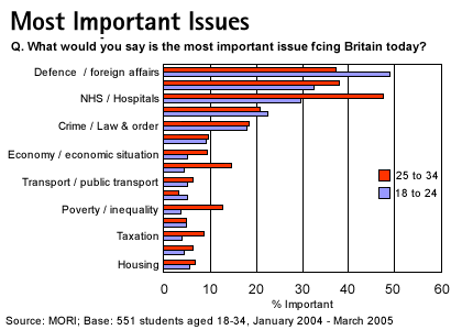 The key issue for 18-24 year old students between January 2004 and March 2005 when asked the question "what is the most important issue facing Britain today?" was defence/ terrorism (49% naming this issue), but conversely more mature students, aged 25-34, regarded the NHS (48%) as the most important. The idea put forward by many commentators that students form a cohesive target group for the Lib Dems is arguable since Labour is regarded by most voters generally as the best party on the NHS, although Liberal Democrats are regarded by most people as the best party on Iraq. The graph below shows this clearly.