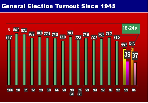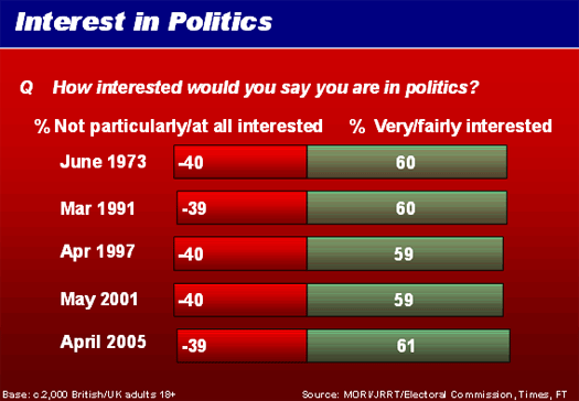 When the turnout dropped precipitously between the 1997 election (`Labour's Landslide') and 2001 (`Labour's Second Landslide') and hardly recovered in 2005 (`Labour's Landslip', which I defined as a `small landslide'), politicians and pundits quickly blamed `apathy'. It wasn't apathy, it was disengagement. There was no decline whatsoever in interest in politics. (Chart 2) Over all this time, interest in politics has been remarkably stable, one of the most stable series of poll findings existing over such a long time.