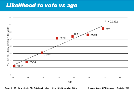 Further, the research carried out for the Hansard Society's 2010 Audit of Political Engagement last November found that when asked whether they agreed or disagreed that `It is my duty to vote', some three people in four agreed. Yet turnout fell to around six in ten of the electorate in the past decade. Two thirds of the electorate in fact disagreed that `politics is a waste of time'. And only one in five thought it was. Delving into the demographic analysis there is no significant difference between men and women, but there is, by age, by social class, and very much by educational attainment. While just over a half, 58 per cent, of those under 35 disagree, seven in ten disagree, and three quarters, 78 per cent, of middle-class people disagree, just over half, 54 per cent, of working class disagree. There is a clear stair step of those who disagree that `politics is a waste of time', 51 per cent of those without qualifications, six in ten of those with GCSE/Os, seven in ten with As, and 81 per cent with degrees. These two attitudinal measures are clearly interrelated with age. (See Chart 3) Seldom does one see a .93 correlation of anything attitudinal with demography, but when contrasting certainty of voting with age, just such a high correlation exists. Fewer than one in three potential voters under 30 are in their minds certain to vote in a general election, jumping to about two in three middle-aged, and over three in four of those over 75. Together, it appears that my long since held maxim that the parties should focus on the old folks, as they have four times the voting power of the youth vote, as there are twice as many of them and they are twice as likely to vote.