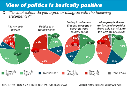 The Hansard Society recently launched "Audit of Engagement 7: The 2010 Report" with a focus on MPs and Parliament" which contains the results of the Ipsos survey carried out last November. This provides a look at the state of British public opinion in the run-up to the impending election to take place on May 6th. In this Worcester's Weblog, I offer some good news from work carried out by MORI for nearly 40 years which counters received wisdom about people's interest in politics. There is a wide-spread believe that dismay, even disgust, towards politics and politicians is widespread, a growing cancer in the state of the nation, and a threat to our democracy. To some degree this is true, but it is in my contrarian view based on values research that it is temporary and if radical action is taken in the near future in addition to that taken recently by the Parliament, which only scratched the surface of reform. There is no question about an erosion of voting, the evidence is clear. (Chart 1):