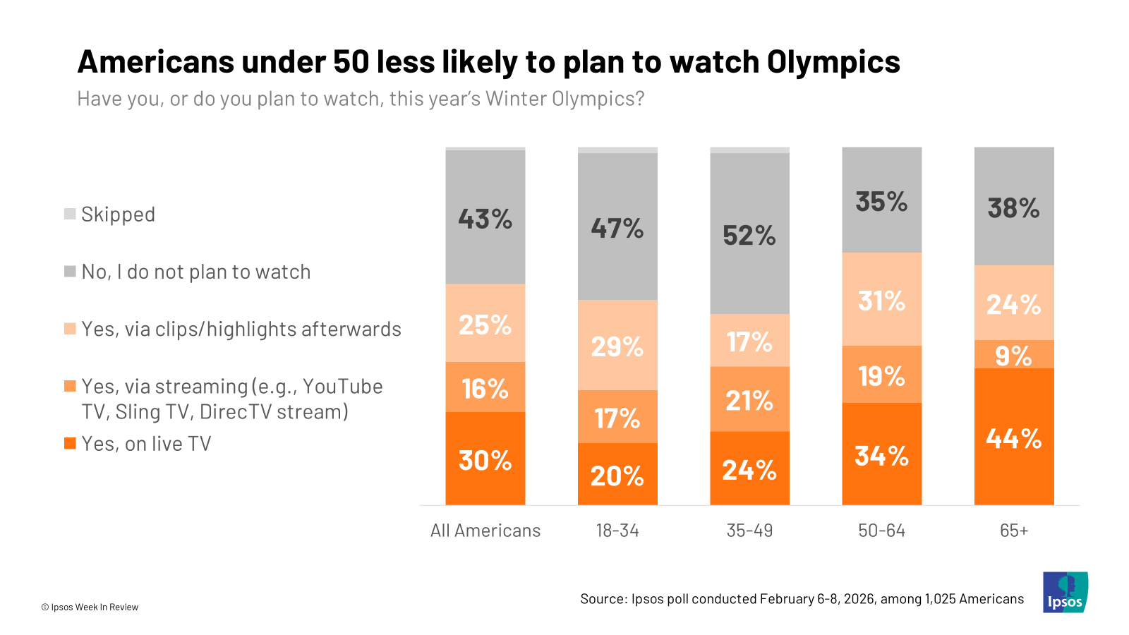 However, younger Americans aren't watching the same way previous generations have. Recent Ipsos polling shows they're less interested in the 2026 Winter Olympics, and when they do tune in, patriotism isn't as big of a draw.