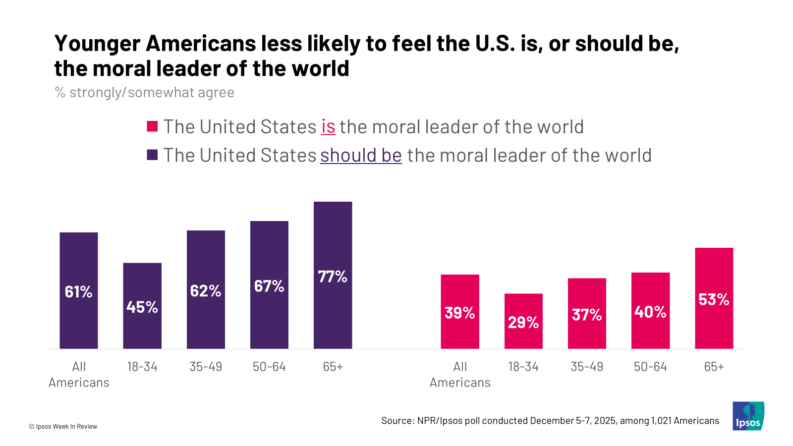 4. America itself – no longer a shining beacon on the hill? Zooming out, younger Americans don’t view the U.S. as the moral leader of the world. In addition, less than half of Americans under 35 think the U.S. should be the moral leader. Younger Americans aren’t just skeptical about the U.S.’ position in the world. They're beginning to reject the aspiration of being the shining beacon on the hill.