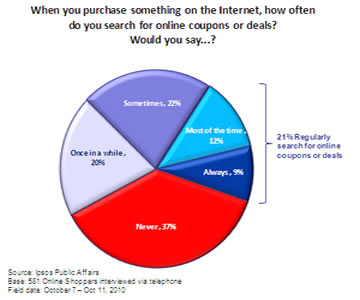 - While frequent shoppers are more likely to search for coupons and deals, still one in four (26%) report they never search for such discounts when buying online. However, a considerably larger proportion (39%) of less frequent online shoppers (those who make online purchases monthly or less often), report that they never search for online coupons or deals.