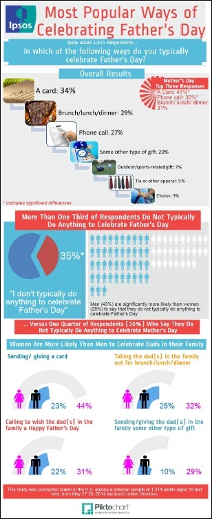 When comparing these results to those of a Mother's Day survey conducted by Ipsos Public Affairs May 2-5, 2014, Mother's Day is more widely celebrated than Father's Day. A greater proportion of U.S. adults say that they don't do anything to celebrate Father's Day than say that they don't celebrate Mother's Day (35% vs. 26%, respectively).