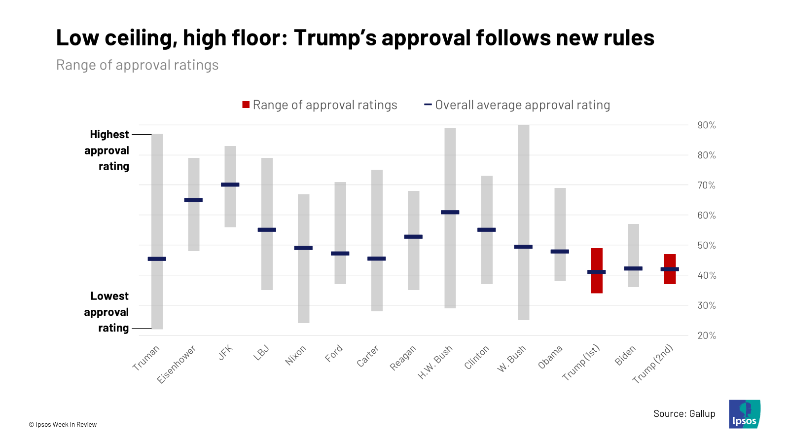 1. A different standard for presidential approval. Today, presidential approval ratings have a high floor and low ceiling due to durable loyalty within the president’s party and consistent opposition from the other party. This trend first became clear in Trump’s first term, persisted through former President Joe Biden’s term, and remains true today.