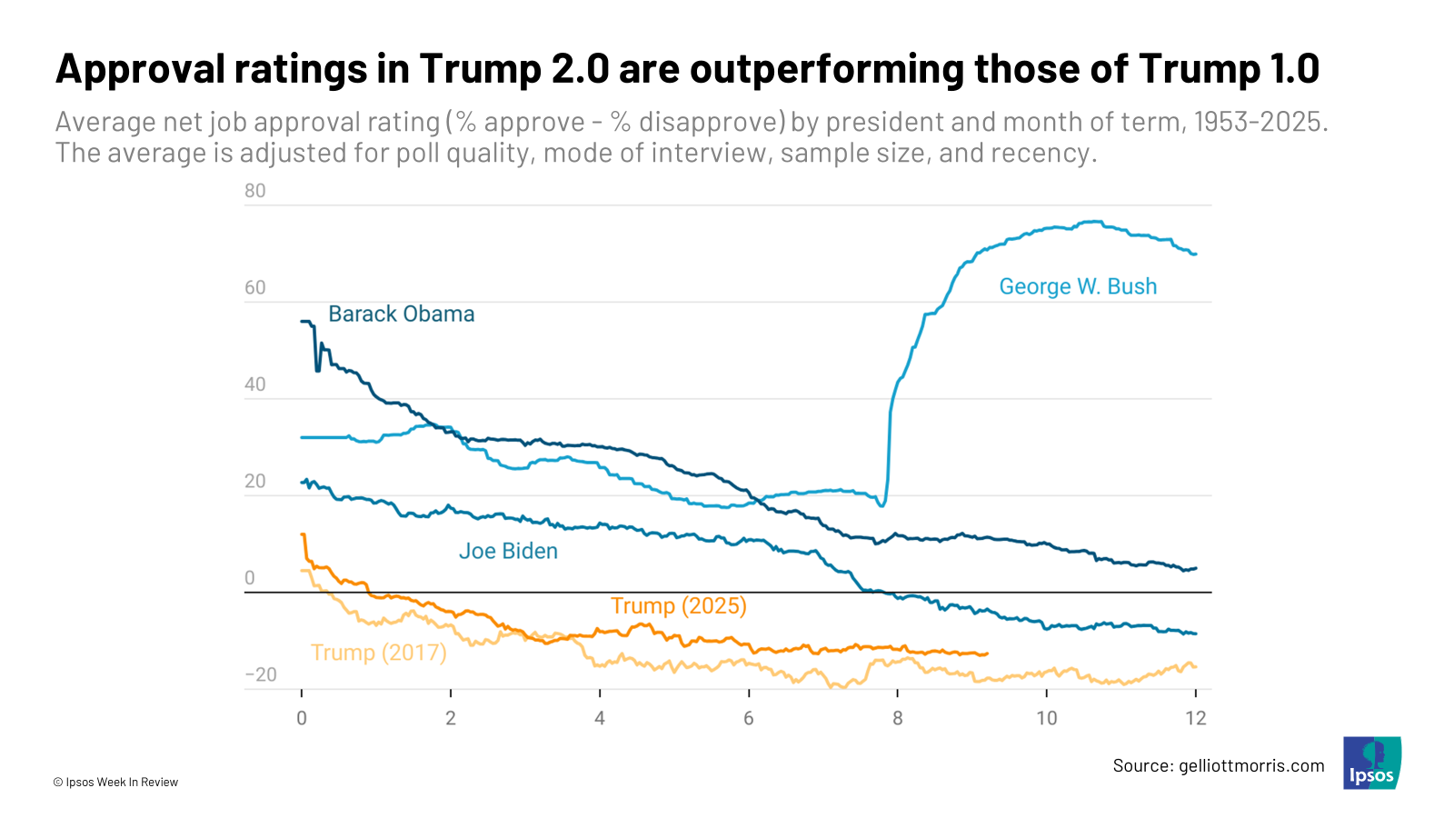 Overall, Trump’s approval is stable and has modestly improved from his first term.