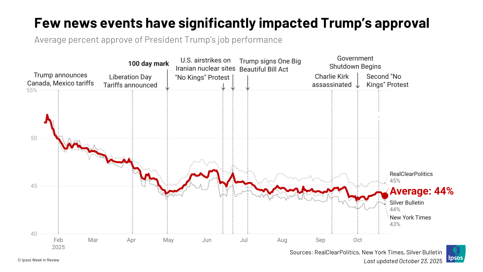 3. News events don’t tend to shift approval ratings. Even highly visible news events, such as the U.S. airstrikes on Iran, rarely move the needle in a significant way. One notable exception is tariffs, which coincided with a drop in Trump’s approval ratings.
