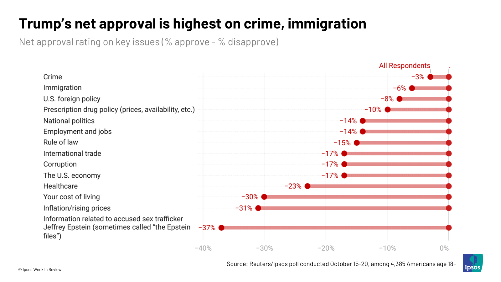 4. Strengths and weaknesses. Trump outperforms his overall net approval rating on crime and immigration. However, his net approval trails on issues that were top of mind for voters in the 2024 election: inflation, the cost of living, and the economy.