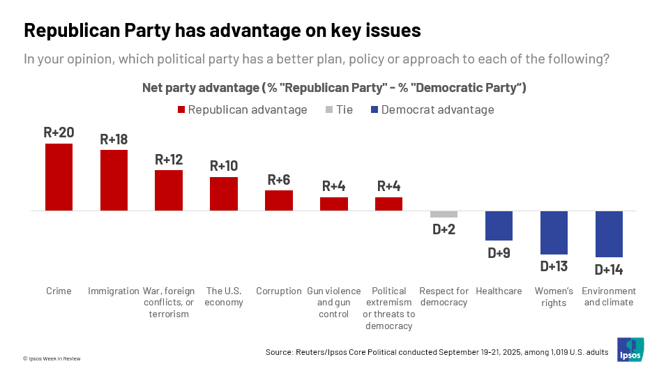 5. The issue landscape favors Republicans. Trump has a negative net approval rating both overall and on key issues. Even so, Americans favor the Republican Party over the Democratic Party on most major issues. The issue landscape was an advantage for Republicans in 2024. It has remained so through 2025.