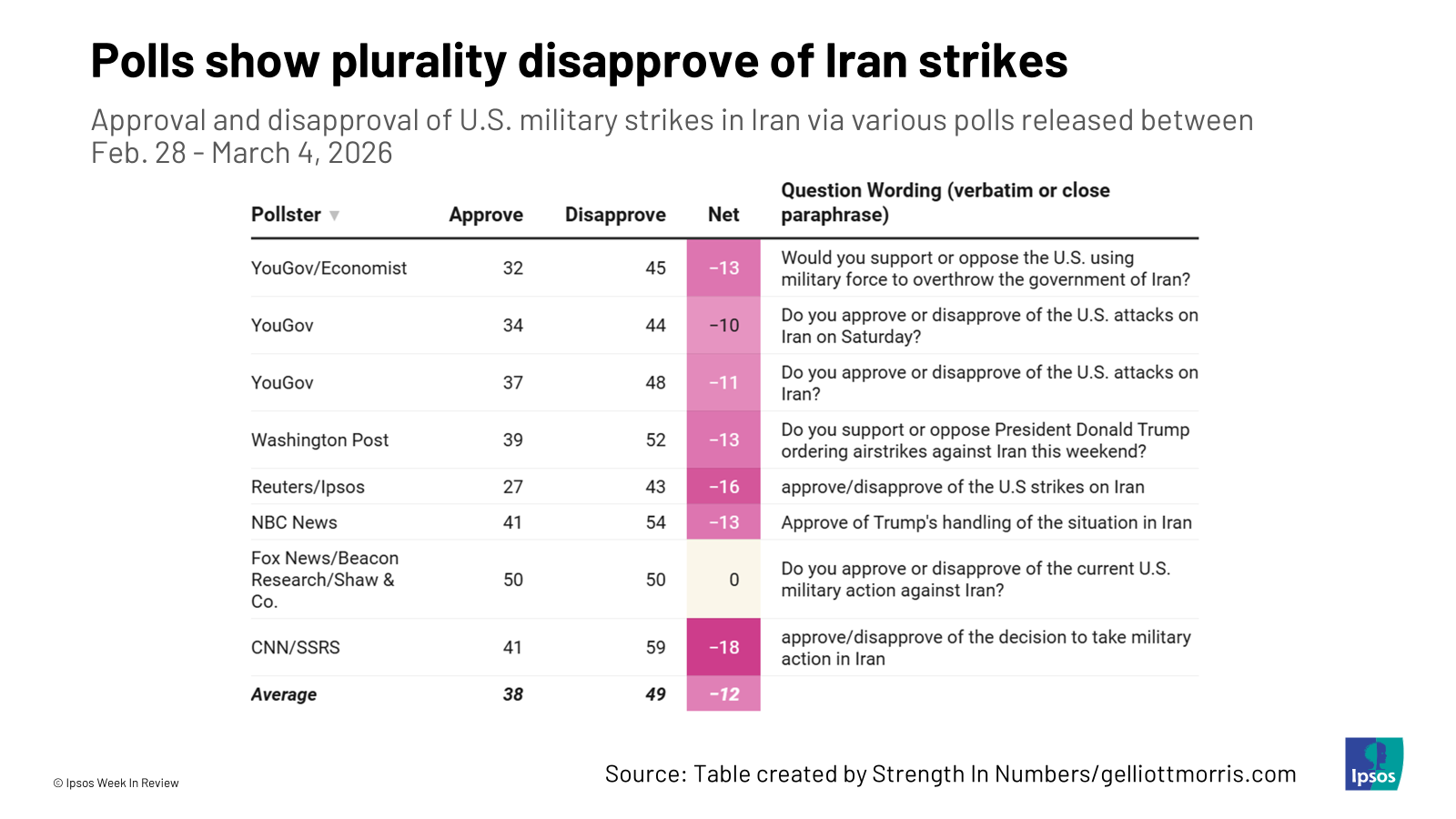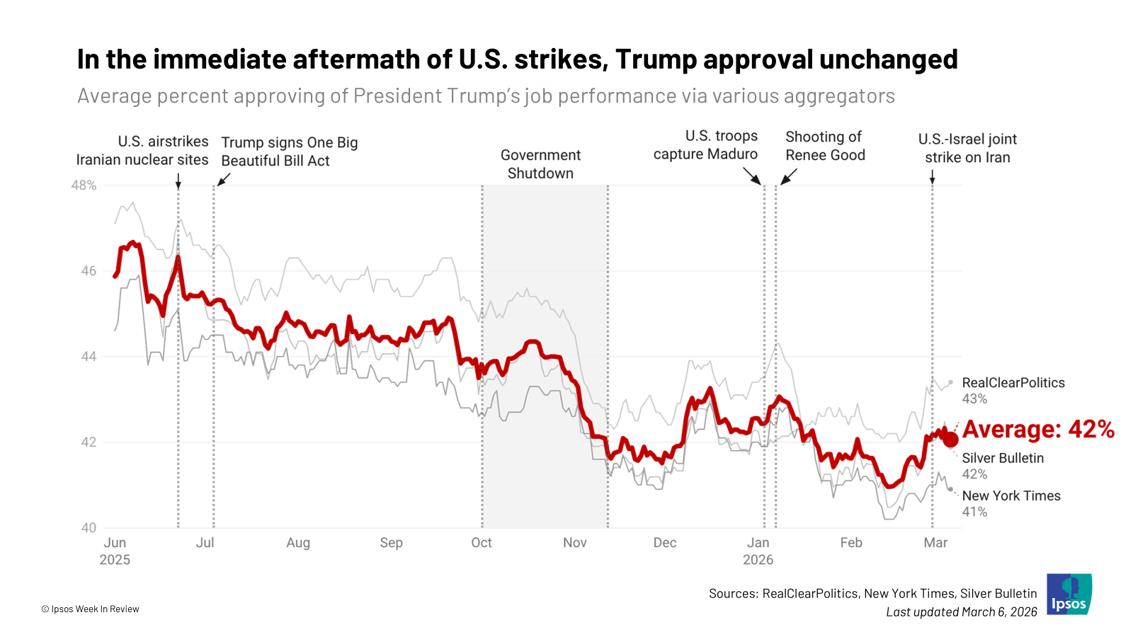 1. America’s first read tilts against the strikes. Across a number of polls, the strikes are facing limited support and notable, but not overwhelming, opposition. These views are similar to how Americans reacted to U.S. involvement in Venezuela and last year’s strikes against Iranian nuclear sites. Of course, a resolution or continuation could shift attitudes. Tomorrow’s polls will be more revealing than today’s.