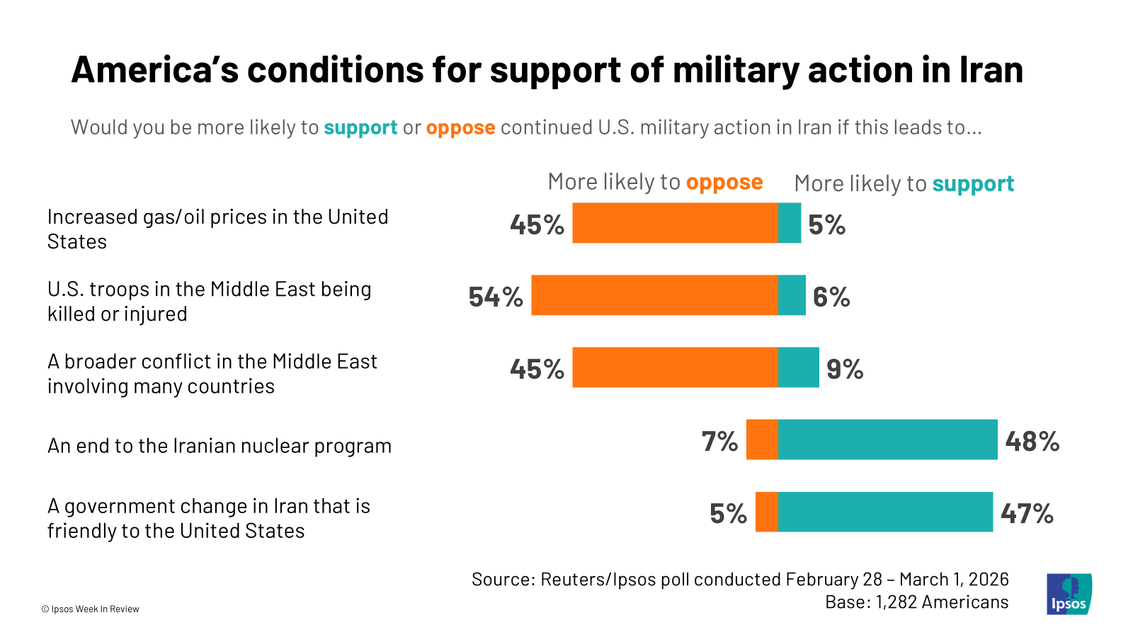 2. What would shift the public’s support? A U.S.-friendly regime change in Iran or the end of Iran’s nuclear program could boost support for U.S. involvement in Iran. But a broader conflict, the deaths of U.S. troops, or increased gas prices could compromise the operation’s already modest support.
