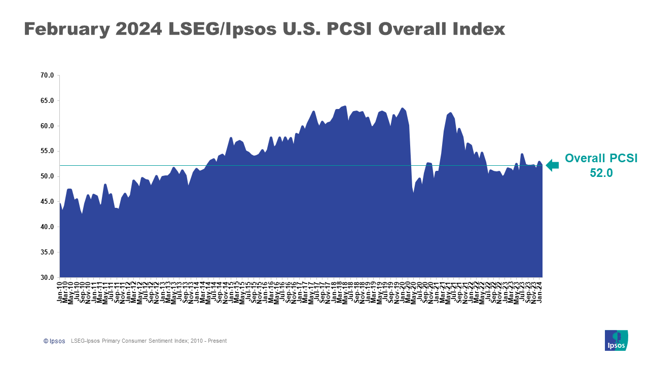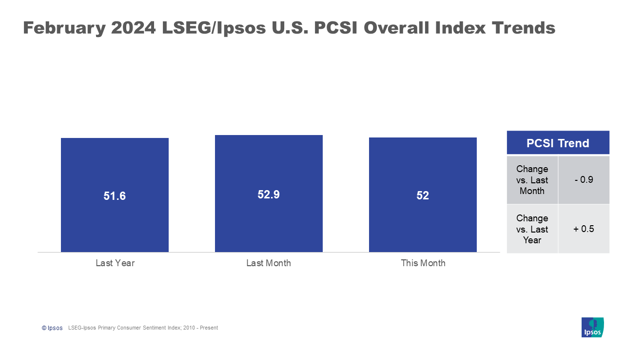 Washington DC, February 20, 2024--The LSEG/Ipsos Primary Consumer Sentiment Index for February 2024 is at 52.0. Fielded from January 26 - February 9, 2024, the Index is down 0.9 point.
