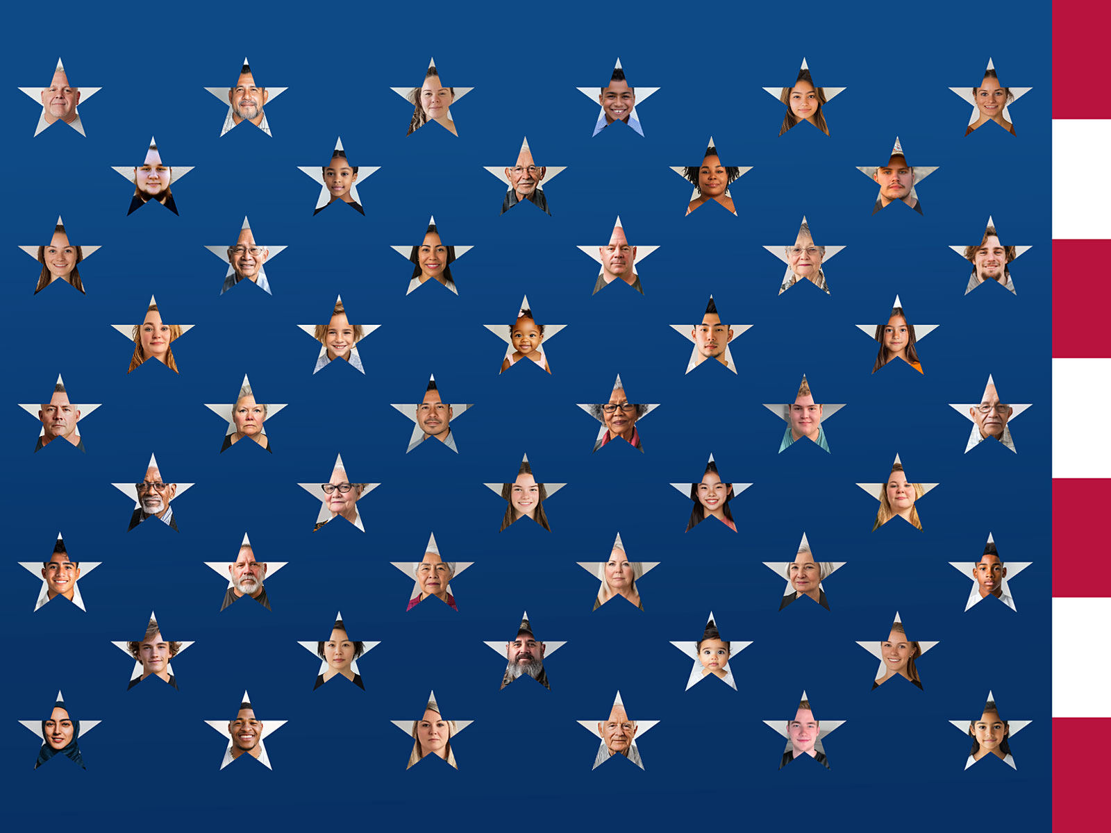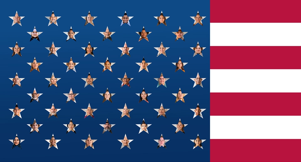 Who lives in America today? Using Census data, this is what the population looks like, based on race, ethnicity, age and gender. Each star represents 2% of the population. It’s not a perfect representation (there isn’t a straight three-way cross tab) but it’s close. In 2030 or 2050 this flag will look different.