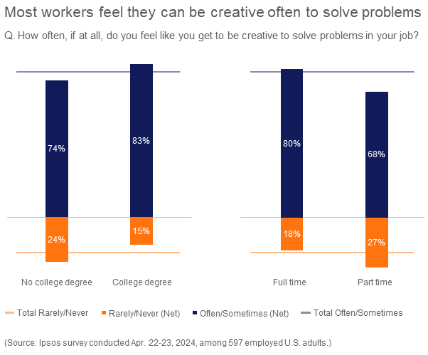 Today, 78% of workers say they get to be creative in some ways at their job. On one hand, if AI can help everyone be a bit more creative than they would otherwise by generating ideas and ready-made images and video — great! On the other hand, will there be a level of sameness and a derivative quality that dilutes creativity? Could generative AI lead to outputs that are less creative in the future?