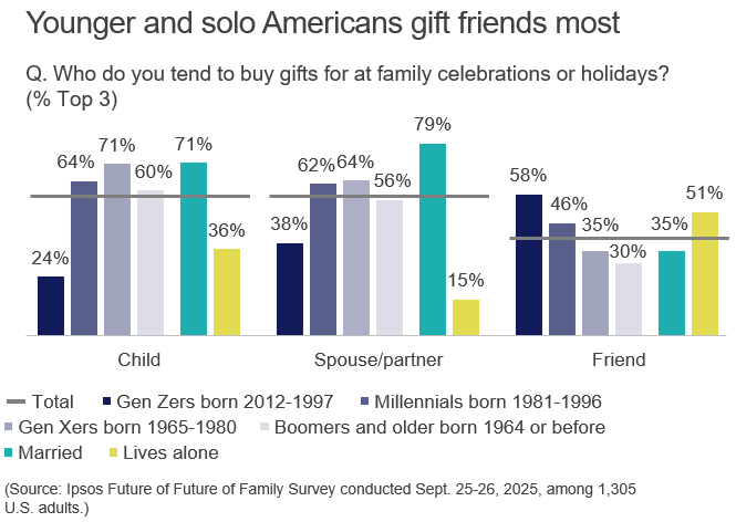 If today’s demographic trends continue, the future U.S. will have fewer marriages, fewer parents and more single-person households. Ipsos research shows that those living alone are more likely to consider friends as family (54%). As social structures evolve, how people celebrate and who they get gifts for will change, too.