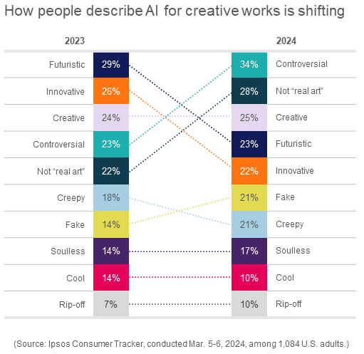 Not too long ago, excitement about AI-generated media was at a fever pitch. But Ipsos’ polling suggests that over the last year, people have grown touchier about the use of AI to produce film, music and literature.