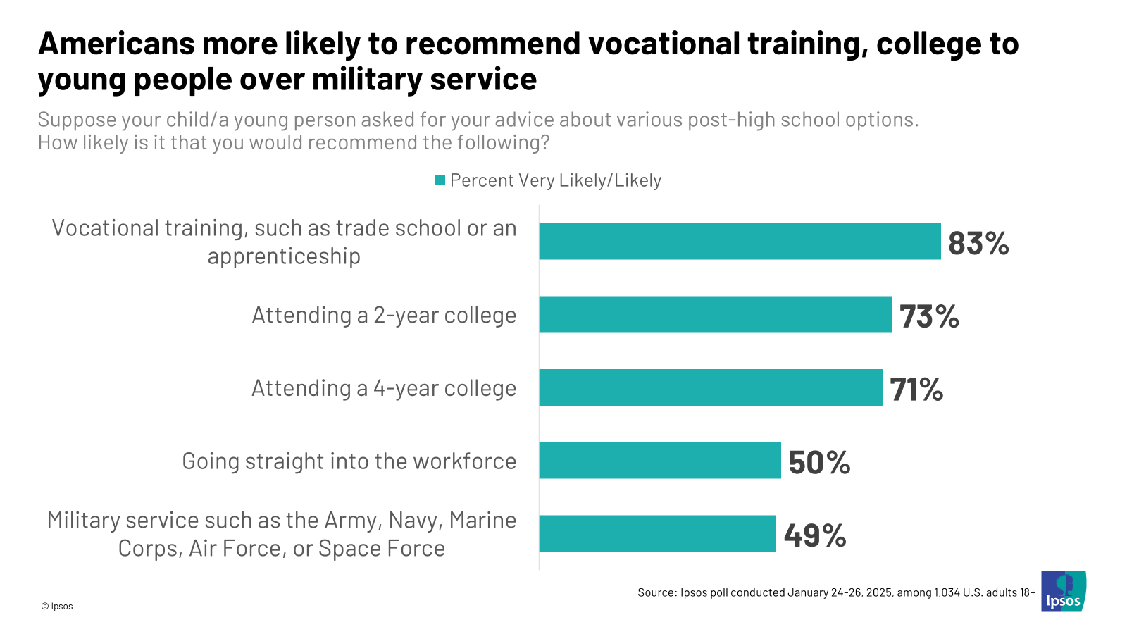Washington DC, February 11, 2025—Ipsos polling finds that most Americans would be likely to recommend vocational training after high school to their child or a young person in their life but are less likely to recommend military service or going to straight into the workforce. At the same, most Americans are familiar with the U.S. military service branches, though few are familiar with the U.S. Space Force.