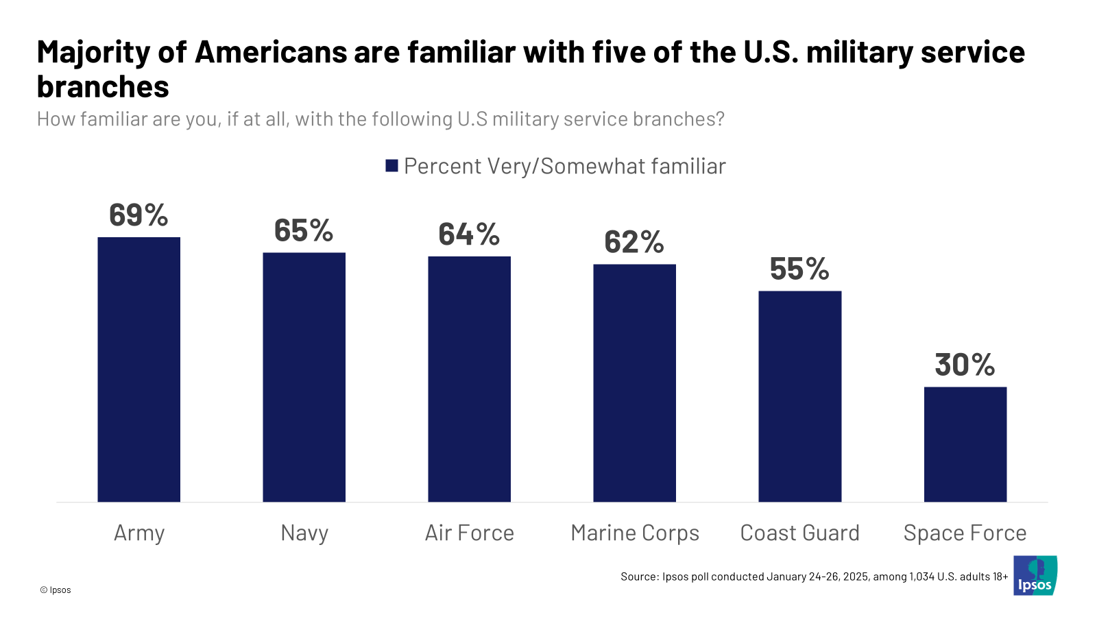 - A majority of Americans say they are familiar with the Army (69%), Navy (65%), Air Force (64%), Marine Corps (62%), and the Coast Guard (55%).