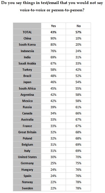 Four in Ten (43%) Globally Say Things in Text or Email They Would Not Say Voice-to-Voice or Person-to-Person
