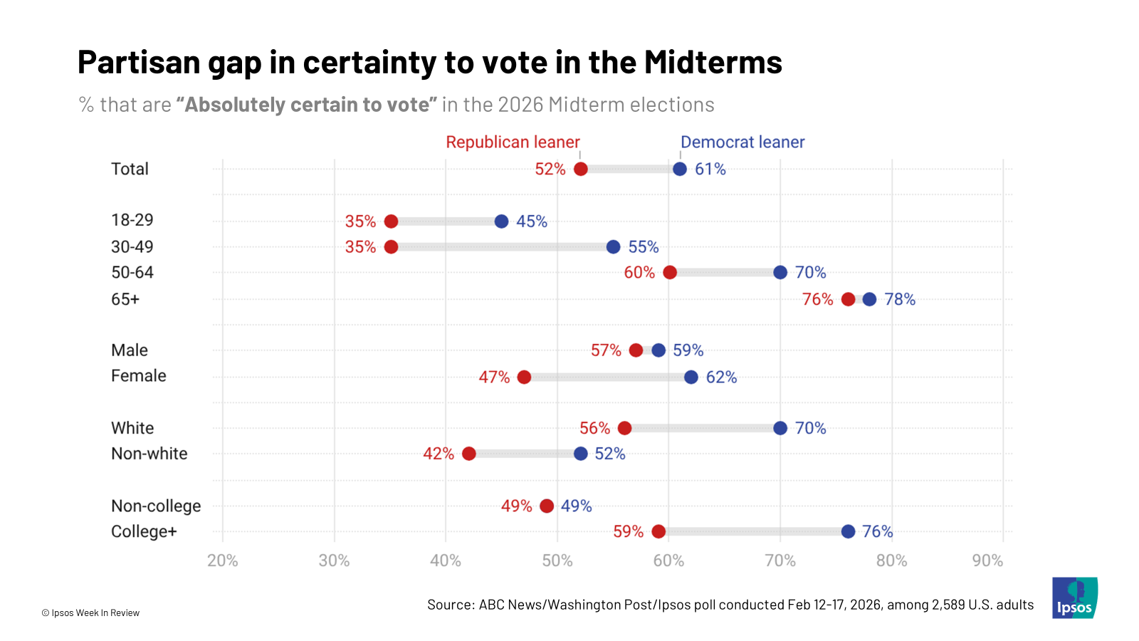 5. Enthusiasm gap. These frustrations are poised to have real ramifications for the Republican Party in 2026. Even if younger and non-white Republicans don’t flip to the Democratic Party, a dip in participation could make an outsized impact. Enthusiasm often decides midterm elections. Right now, Democrats have the upper hand among these groups.